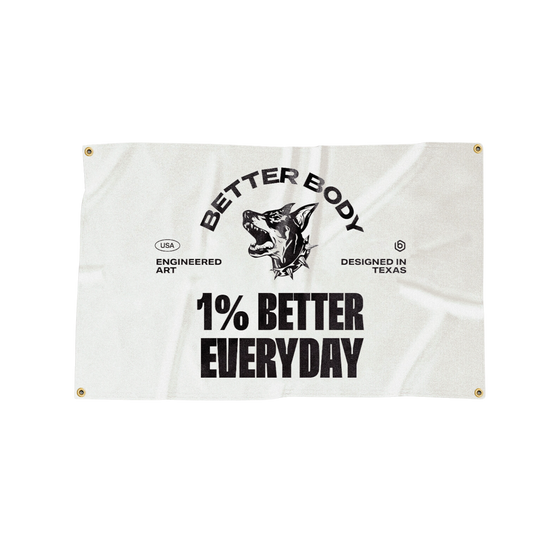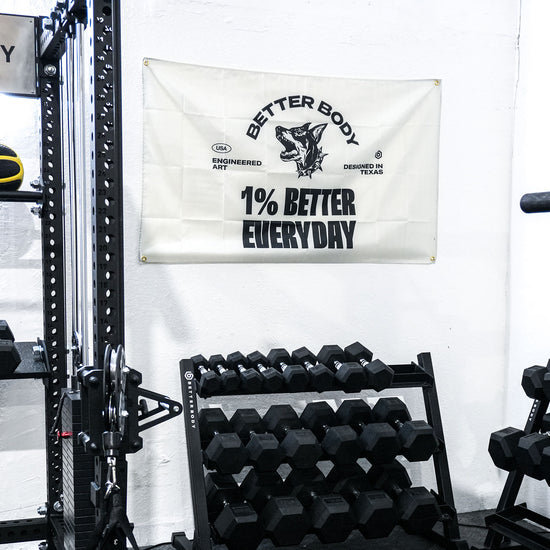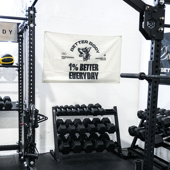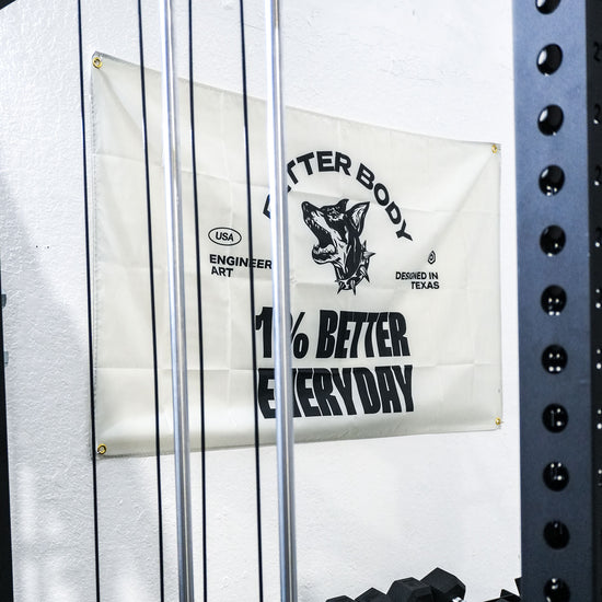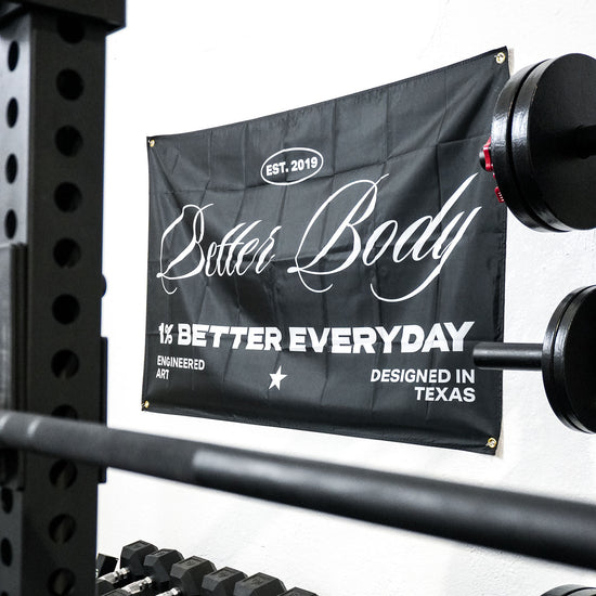 Show off your dedication to the 1% better mindset with our exclusive Better Body banners. Available in four unique designs, these banners represent the grit and determination forged in Texas and the innovative energy from Miami. Each banner features reinforced ring holes, making them easy to hang on any garage or home gym wall, ensuring your space looks sharp and ready for action. Whether you're building strength in your basement or garage, these banners help you represent Better Body Equipment and stay motivated every day.