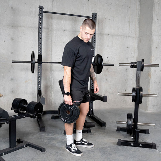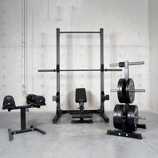 | Bundle includes | Set of Weight Plates, Standard Squat Rack, Barbell, Premium Bench, Barbell Collars, Plate and Bar Rack, Pro Dumbbell Set & Pro Dumbbell Rack |