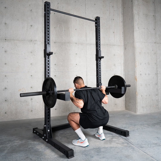 - Adjustable Squat Stand 2.0: Built from heavy-duty steel with a max load of 1,700 lbs, this rack is available in three height options—90", 80", and 70"—to fit your space and training needs. It includes integrated plate storage, a height-adjustable pull-up bar for customized grip positioning, adjustable spotter arms, and a skinny pull-up bar for added versatility in your workouts.